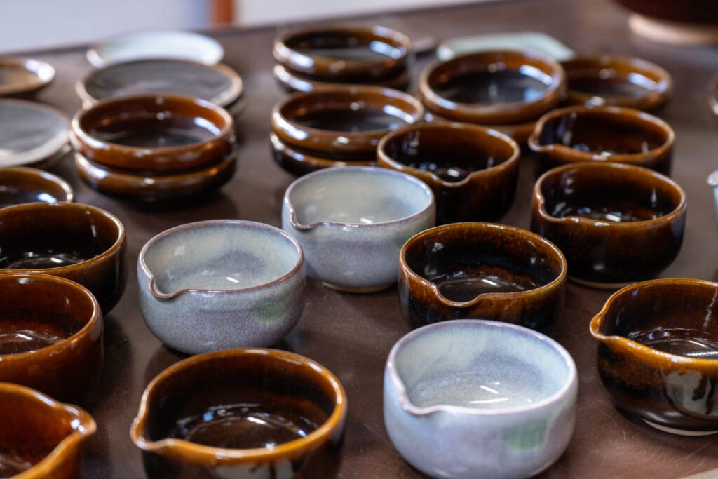 陶雅陶楽の器を特徴づけているのは、主に二つの釉薬だ。水色の「灰釉」と、茶色の「飴釉」。「基本はこの二色ですね。」そう言いながらも、佐藤さんは最近、少しずつ新しい色にも取り組んでいる。白、黒、濃い紺色。ただし、やみくもに増やすわけではない。「伝統的なベースは、あまり崩したくないという思いもあって。」形はあくまで本郷焼の伝統に則り、色だけを今の感覚に寄せる。逆に形で遊びたいなら、色はおとなしく。いわば、静かなハイブリッドだ。