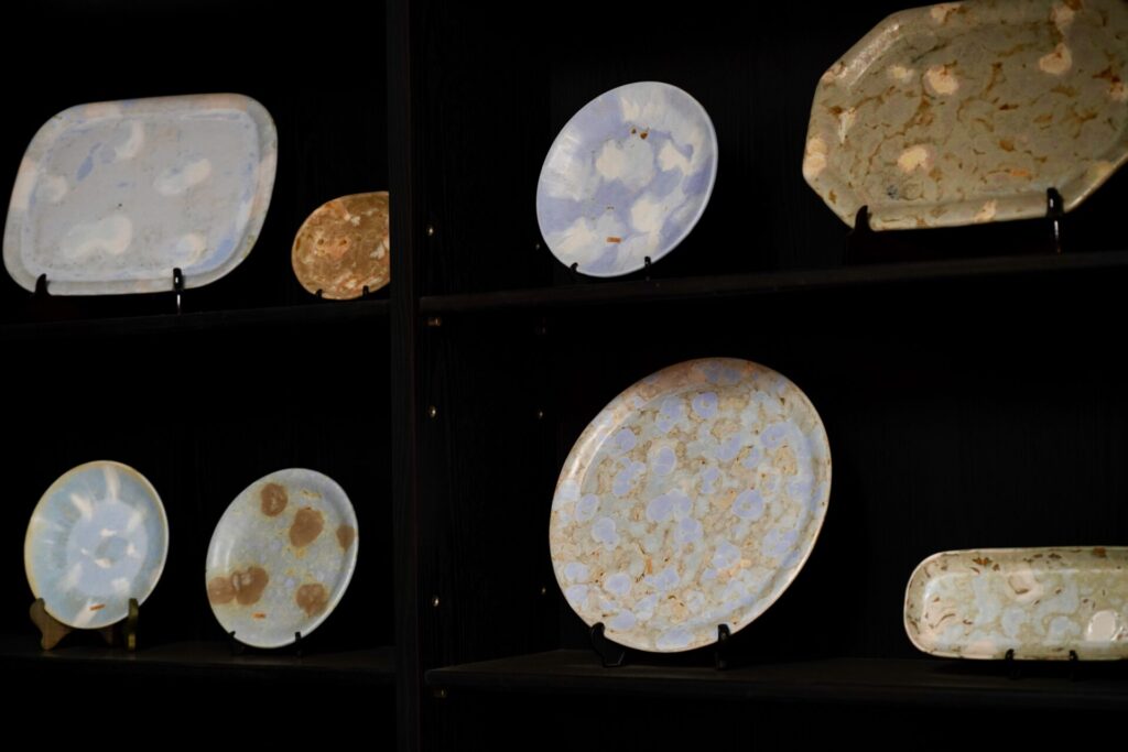 経営を安定させるための「武器」として、西田さんが開発したのが「メルヘン釉薬」だ。 伝統的な渋い酔月窯のイメージとは真逆の、パステルカラーや鮮やかなブルーを使った洋風の器。筆で釉薬を塗り重ね、ムラを作ることで、まるで空や雲のような表情を生み出す。