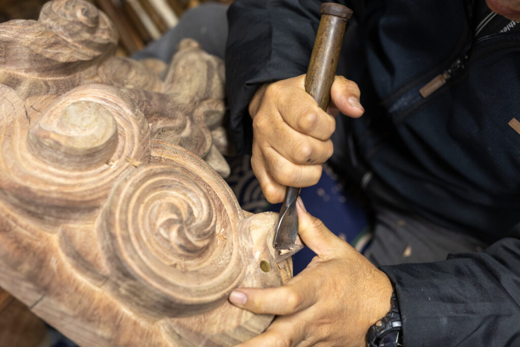 「彫刻が終わると、次は漆塗りや金属補強など、それぞれの職人の手を経て完成します。地元の祭りに間に合わせるため、スケジュール管理がとても難しいです」と知田さんは語る。彫刻を施した木材を漆塗り職人に渡し、その後、金属部品で補強を行う工程を経るが、各工程に時間と技術を要するため、職人間でのスムーズな連携が欠かせない。